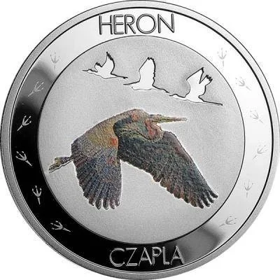 Inner circle: Color herons. Top reverse: Three herons in flight. Outer circle: Stylized heron tracks.
