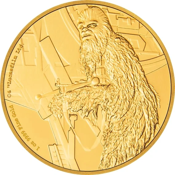 Chewbacca with his bowcaster before the Millennium Falcon in "A New Hope".