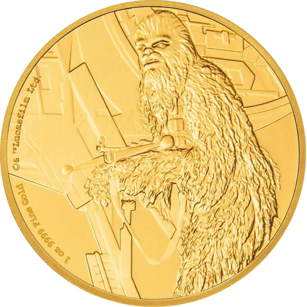 Chewbacca with his bowcaster before the Millennium Falcon.