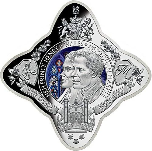 Description: This coin features an engraved portrait of the couple before St. George's Chapel windows. It includes their monogram "H&M," the wedding date, and royal emblems: the Rose of England, an exterior view of the chapel, and the British coat of arms with its lion and unicorn supporters.