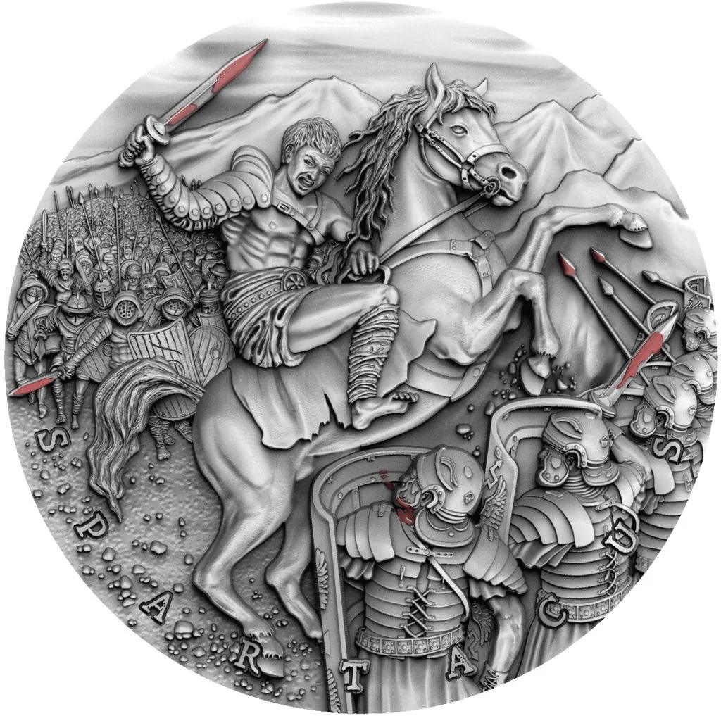 Spartacus battles Romans on horseback, aided by slaves and gladiators. Note the insurgents' knives, gold-plated to imitate blood.