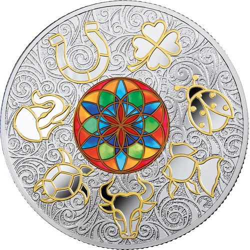 Central stained-glass with Ladybird, Clover, Horseshoe, Elephant, Goldfish, Turtle, and Bull.