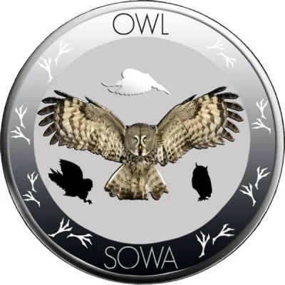 Inner circle: a colorful owl with three bird silhouettes in motion behind it. Outer circle: stylized owl footprints.