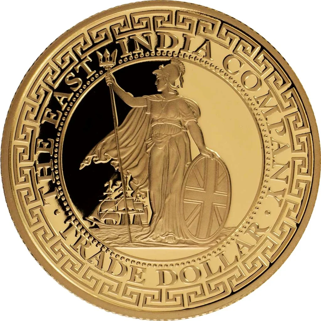 Description: Inspired by early 1900s Silver Trade Dollars, this design features a helmeted Britannia standing with trident and shield. A traditional Chinese scroll-pattern frames the scene, which includes a sailing merchant ship in the background.