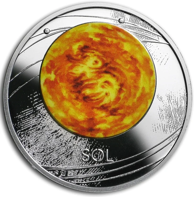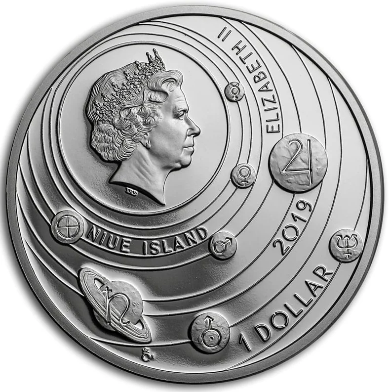 The solar system with its planetary symbols, centered by a portrait of Queen Elizabeth II.