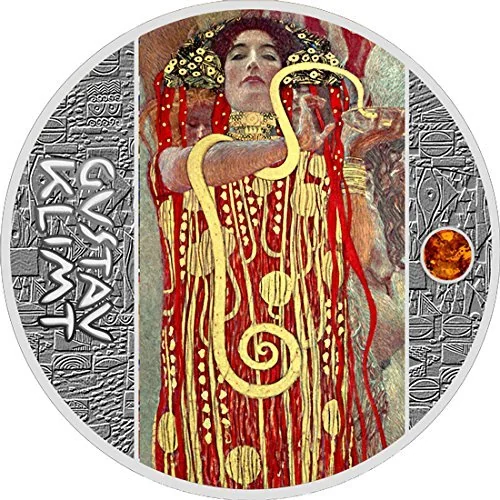 A coin depicting Igea, goddess of Medicine, with an amber insert on the right.