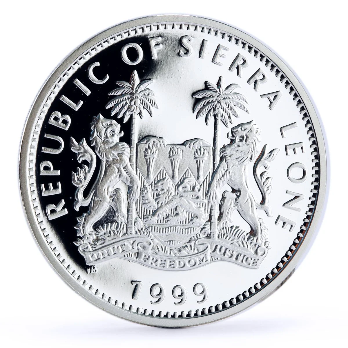 Coat of arms (1960) with the incuse motto "UNITY FREEDOM JUSTICE." Mintmark PM (Pobjoy Mint) at lower left. Legend above: REPUBLIC OF SIERRA LEONE; year at bottom.