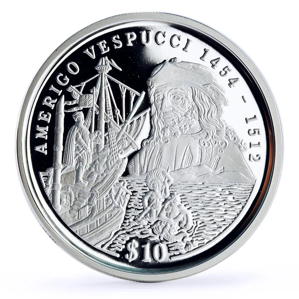 Amerigo Vespucci bust before a ship's bow. Legend: name, years 1454-1512, value $10.