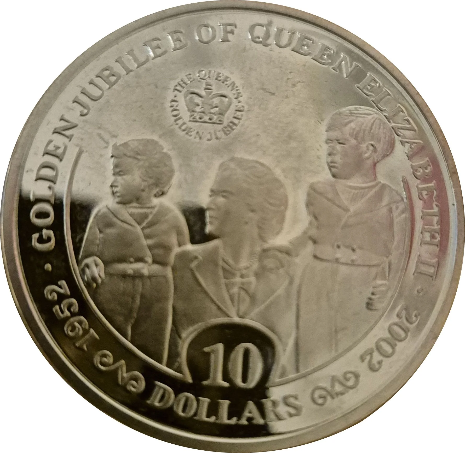Queen Elizabeth II with Princess Anne and Prince Charles. Circular inscription: THE QUEEN'S•GOLDEN JUBILEE•. Value: 10 DOLLARS. Legend: GOLDEN JUBILEE OF QUEEN ELIZABETH II. Dates: 1952 • 2002.