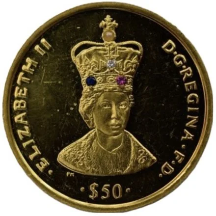 Bust of Queen Elizabeth II in St Edward's Crown, set with four 0.005 ct stones: diamond, ruby, sapphire, and pearl.