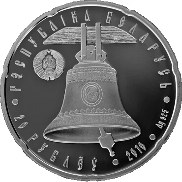 Description: Centered: a relief bell with the State Coat of Arms of Belarus to its left. Around: "РЭСПУБЛІКА БЕЛАРУСЬ" above, "20 РУБЛЁЎ" below with the year and alloy standard to the right.