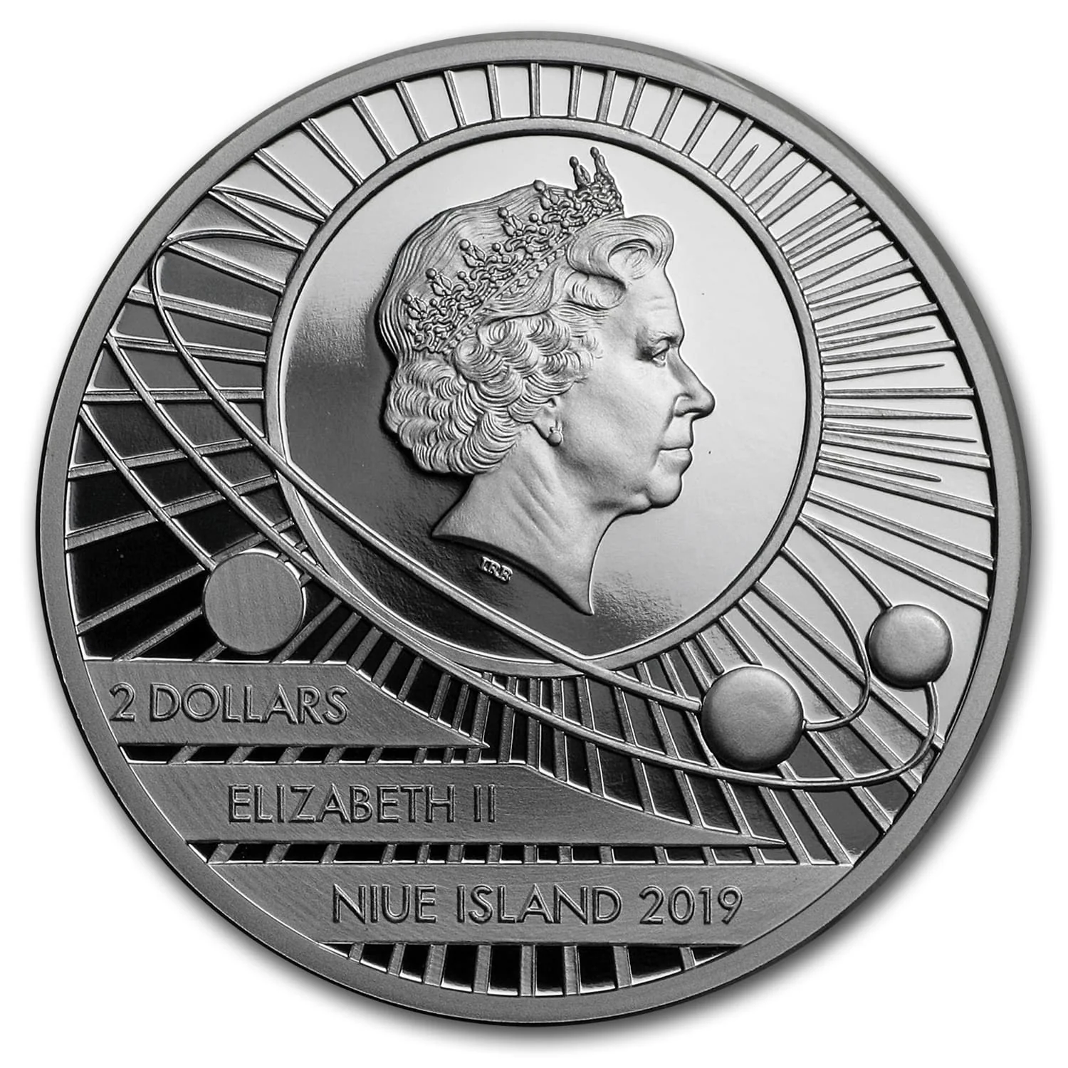 The solar system with its planetary symbols, centered by a portrait of Queen Elizabeth II.