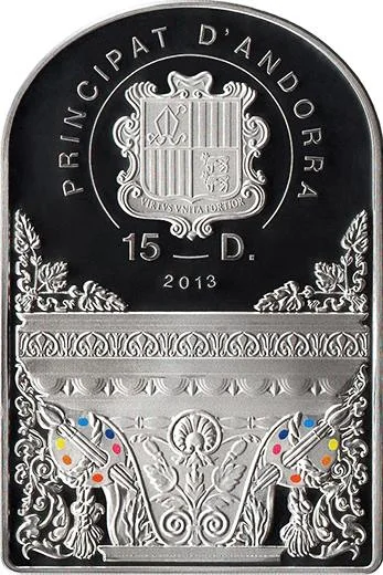 Andorran coat of arms on a capital, flanked by floral designs and painter's palettes.
