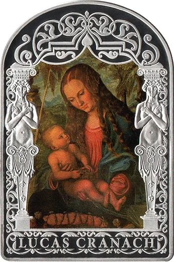 Lucas Cranach's "Madonna Under the Fir Tree" between female columns.