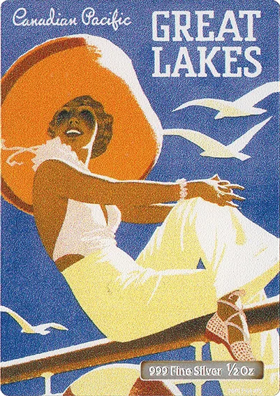 Vintage 1930s Canadian travel poster: a woman sits on a ship's rail in the sunshine, birds flying by.