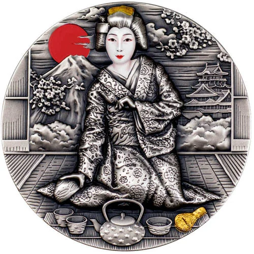 A geisha effigy with tea tools, backed by Mount Fuji, a pagoda, and the sunset.