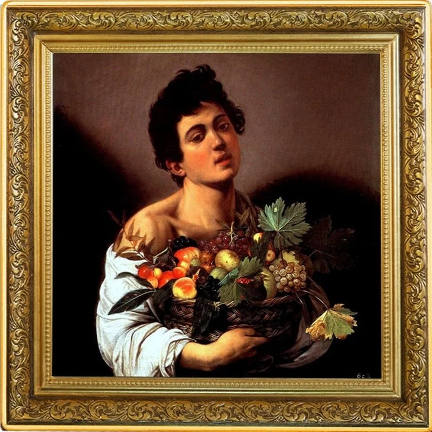 Caravaggio's "Boy with a Basket of Fruit" within a decorative frame.