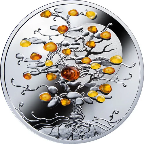 Center: amber Tree of Luck (relief, digital print, selective plating). Background: stylized sun (laser frosting).