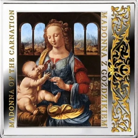 A multicolored replica of "Madonna of the Carnation" with Renaissance-style ornamentation on the right.