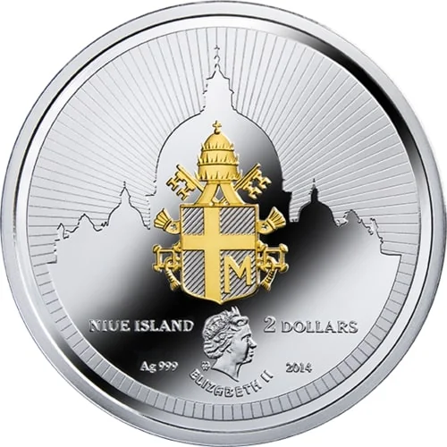 Papal coat of arms of John Paul II with St. Peter's Basilica, and a miniature effigy of Queen Elizabeth II below.