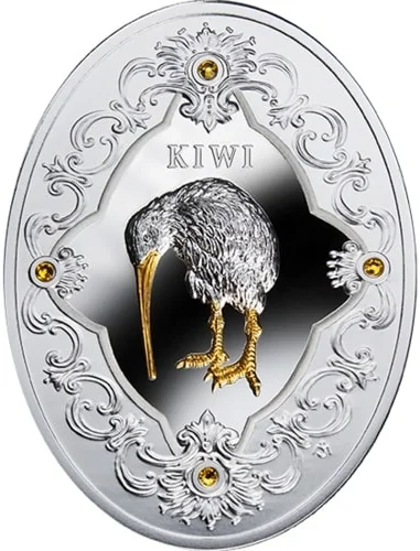 A gilded, high-relief Kiwi statuette adorned with stylized ornaments and Swarovski crystals.