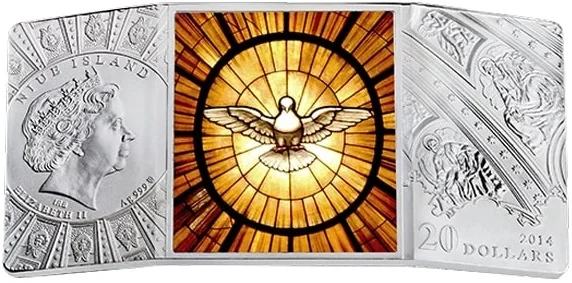Center: St. Peter's Basilica Holy Spirit stained glass. Left: Effigy of Queen Elizabeth II. Right: St. Peter's dome frescoes.