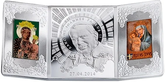 A central image of John Paul II with a halo. Below, an outline of St. Peter's Basilica and his canonization date. Flanking the pope are multicoloured images of the Black Madonna of Częstochowa and Mary the Mother of the Church.