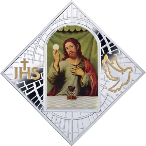 A multicolored image of Juan de Juanes's "Christ with the Chalice," flanked by the IHS christogram and the dove of the Holy Spirit.