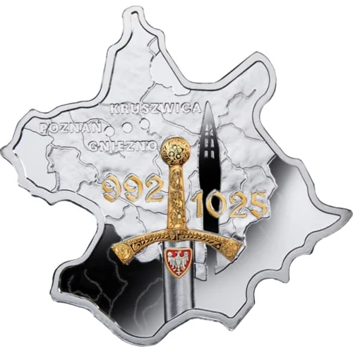 A coronation sword bearing Bolesław Chrobry's reign dates (992–1025), with the Piast capitals Poznań, Gniezno, and Kruszwica above.