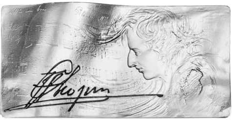 A dynamic portrait of Chopin overlaid with his handwritten score for the Polonaise in A major, Op. 40, No. 1, featuring his stylized signature.