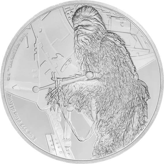 Chewbacca with his bowcaster before the Millennium Falcon.