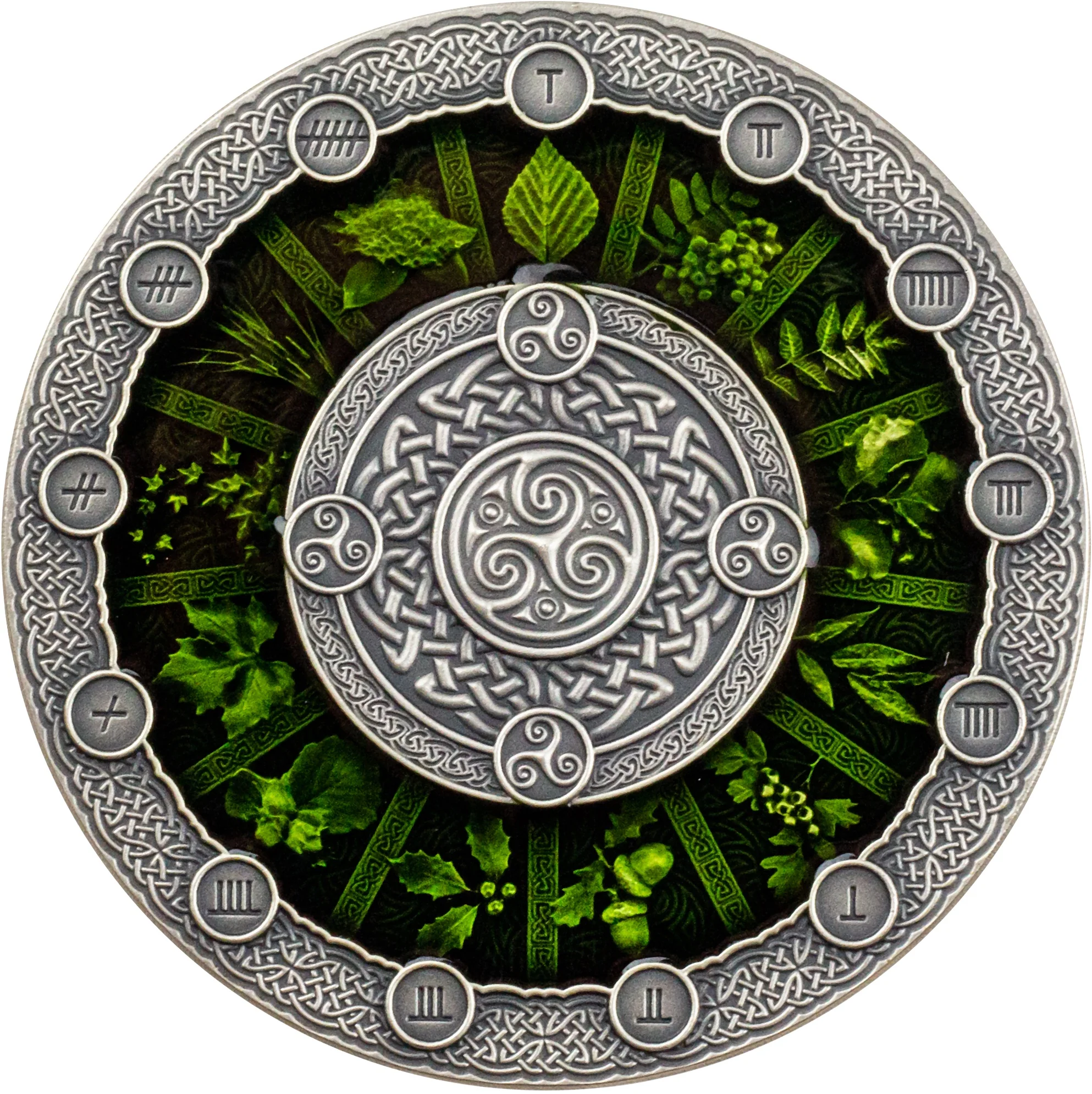 Description: The surface has three concentric circles. The outer ring features 13 encircled Ogham letters for the Celtic Tree Calendar Moons, set clockwise from the top amid Celtic ornaments. The middle green ring displays the 13 corresponding plants: Birch (Betula sp.), Rowan (Sorbus sp.), Ash (Fraxinus sp.), Alder (Alnus sp.), Willow (Salix sp.), Hawthorn (Crataegus sp.), Oak (Quercus sp.), Holly (Ilex sp.), Hazel (Corylus sp.), Vine (Vitis sp.), Ivy (Hedera sp.), Reed (Phragmites sp.), and Elder (Sambucus sp.). The central part has four smaller encircled triskelions for the seasons, surrounding a larger central triskelion for the year.
