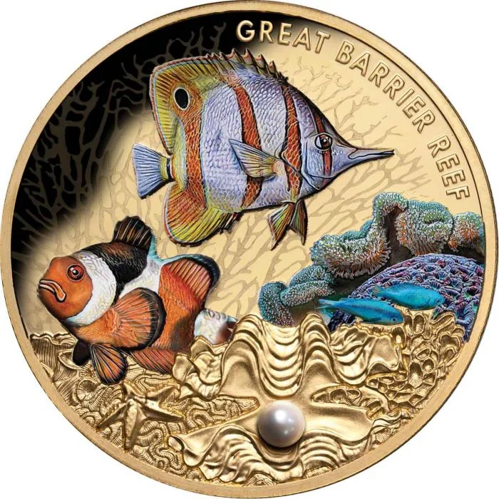Vibrant tropical sea creatures—starfish, clams, and coral—form a detailed backdrop, enhanced by a real pearl.