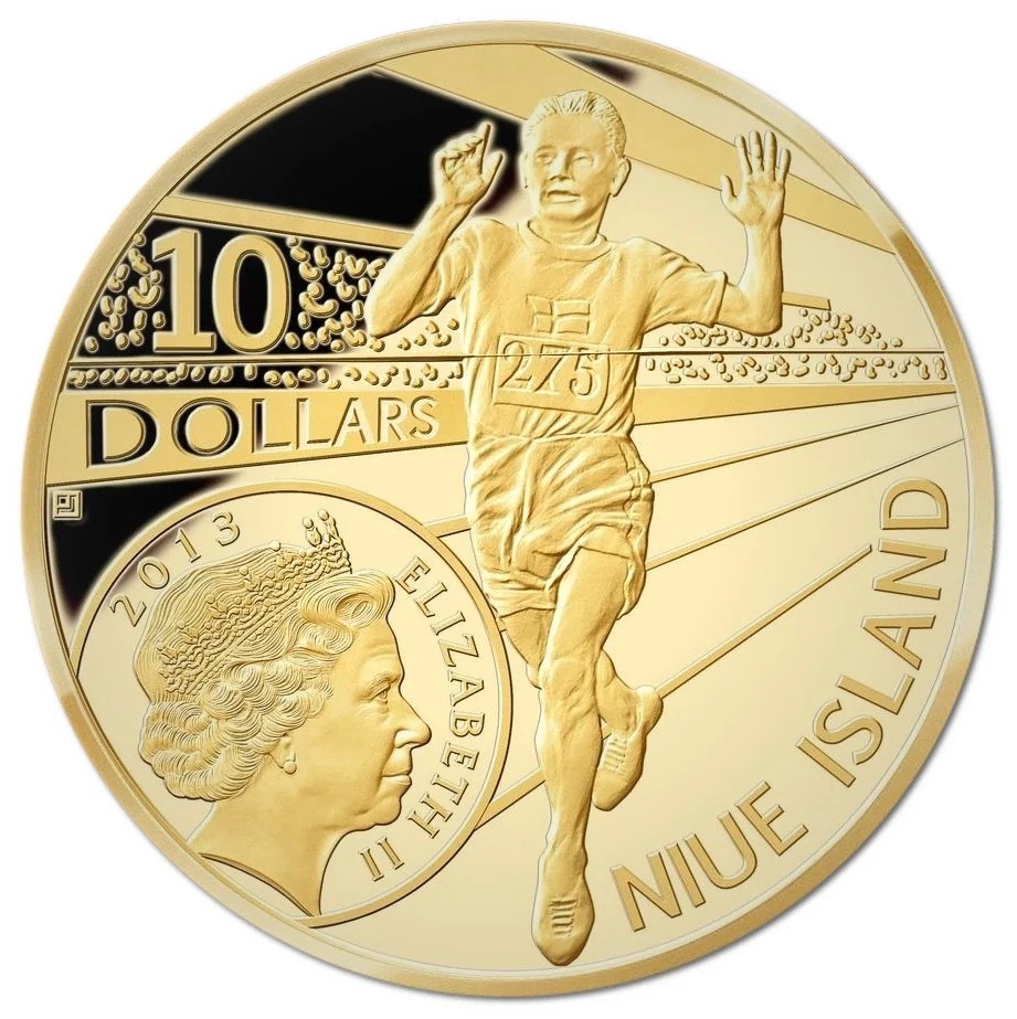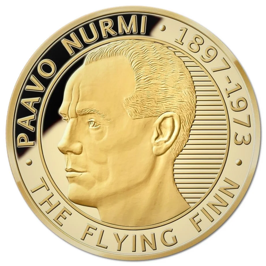 Paavo Nurmi running with Queen Elizabeth II's effigy.