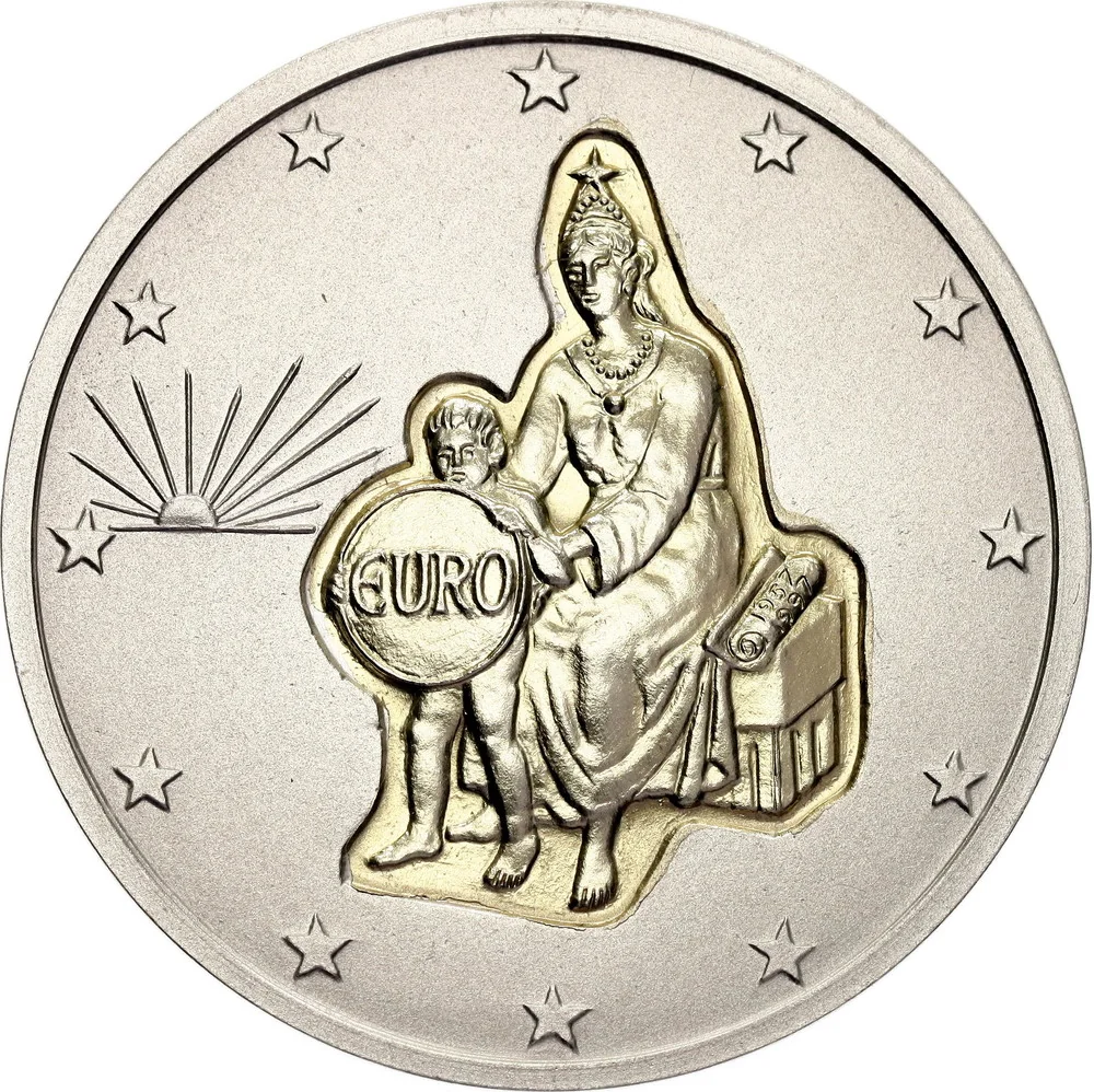 Gold-inlaid seated Europa with child and shield, encircled by the twelve European stars.