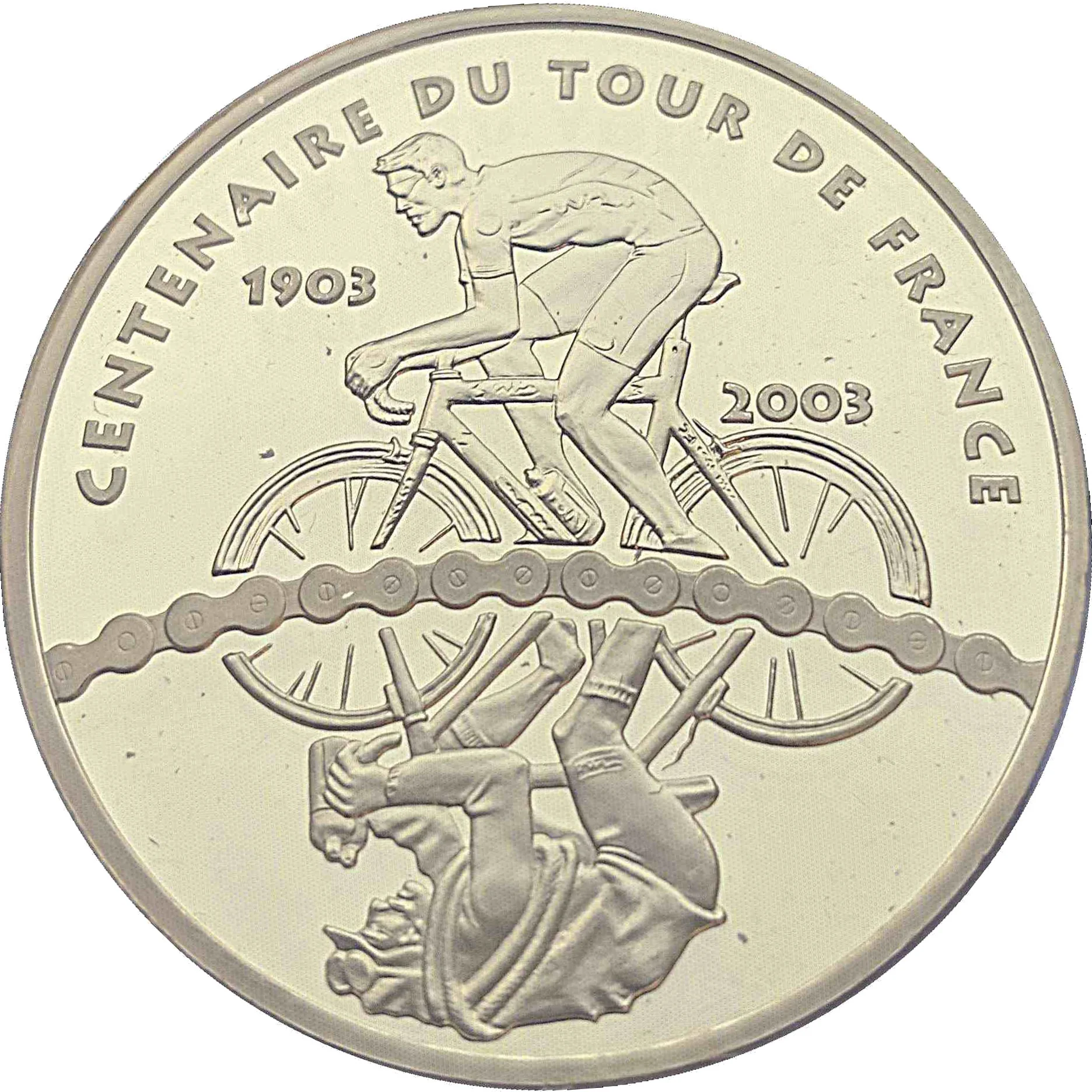 Description: Stylized bicycle spelling "Le TOUR de fRance": the O is the back wheel, the U is the saddle, and the R forms the cyclist. The sun acts as the front wheel, all set upon a globe's arc.