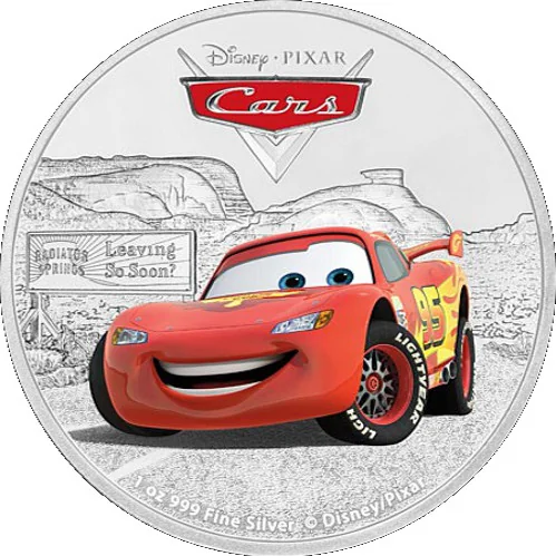 Lightning McQueen, colorized, with Radiator Springs sign behind.