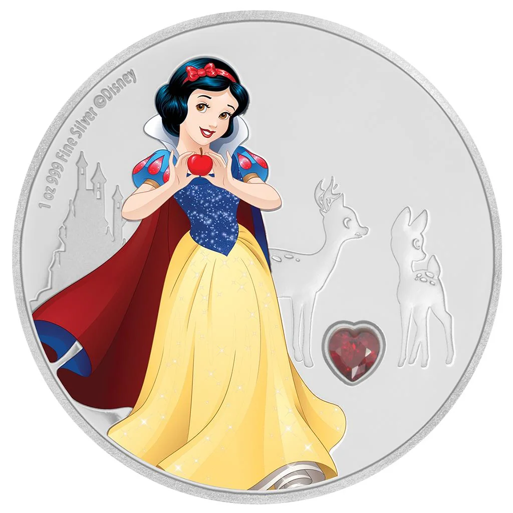 Snow White in her iconic dress and hair bow, holding the poisonous red apple, with her castle and two forest deer engraved behind her.