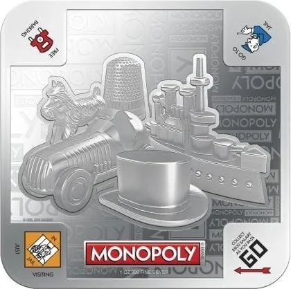 Five original Monopoly tokens with "MONOPOLY" repeated behind them.