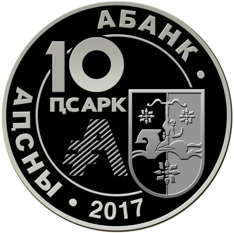 The national emblem of Abkhazia is centered above the Abkhaz inscription "Apsny Abank," with the denomination "10 apsars" above it. The mint year "2017" is at the bottom.
