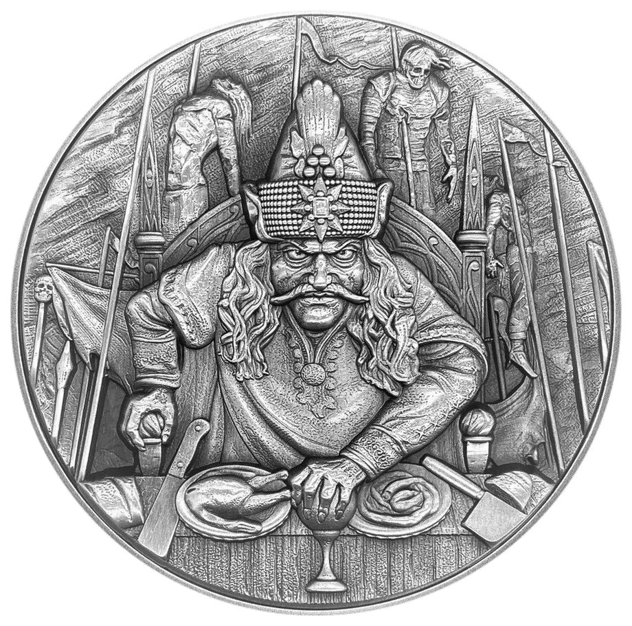 Vlad the Impaler feasts amid a scene of horror, with the impaled corpses of his victims looming behind him.