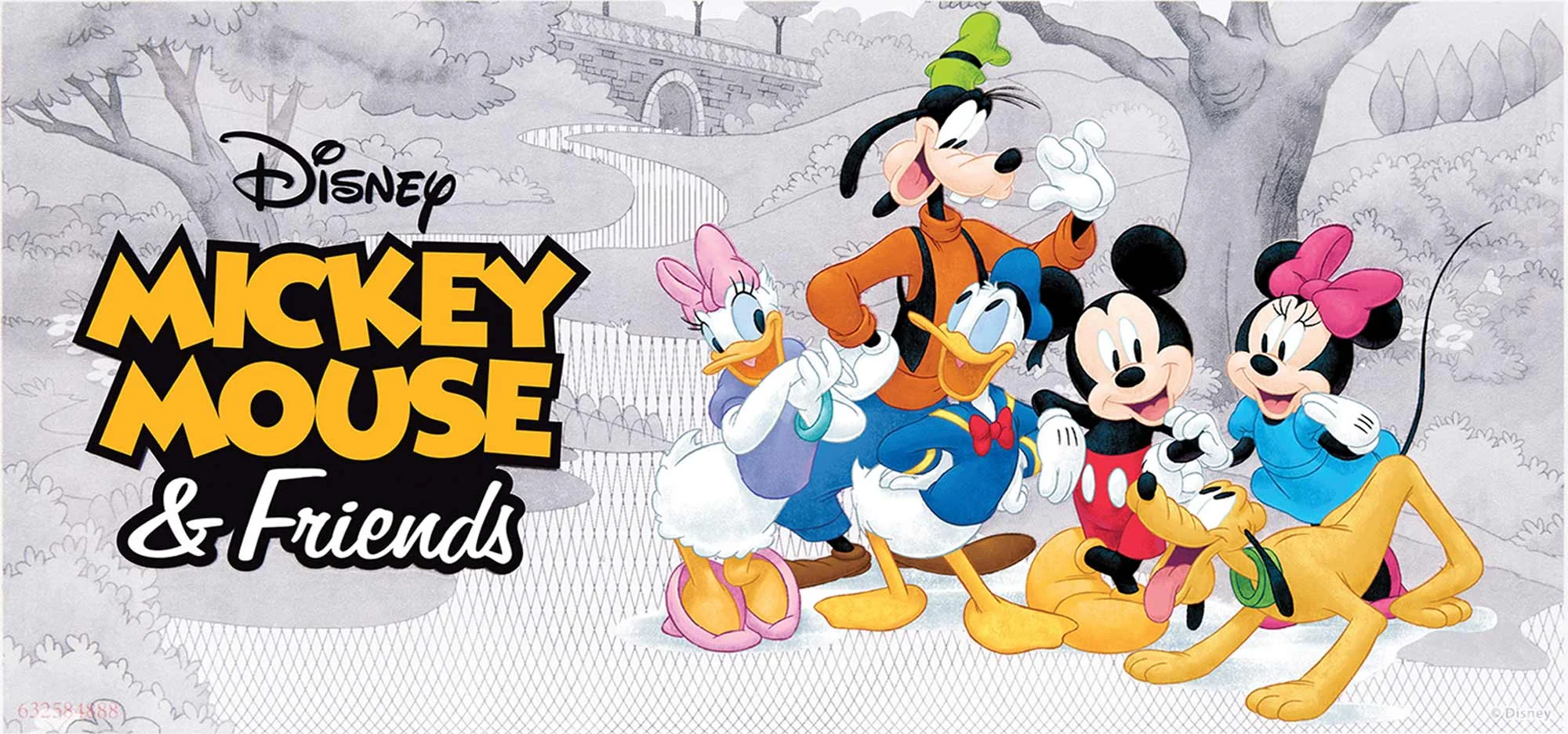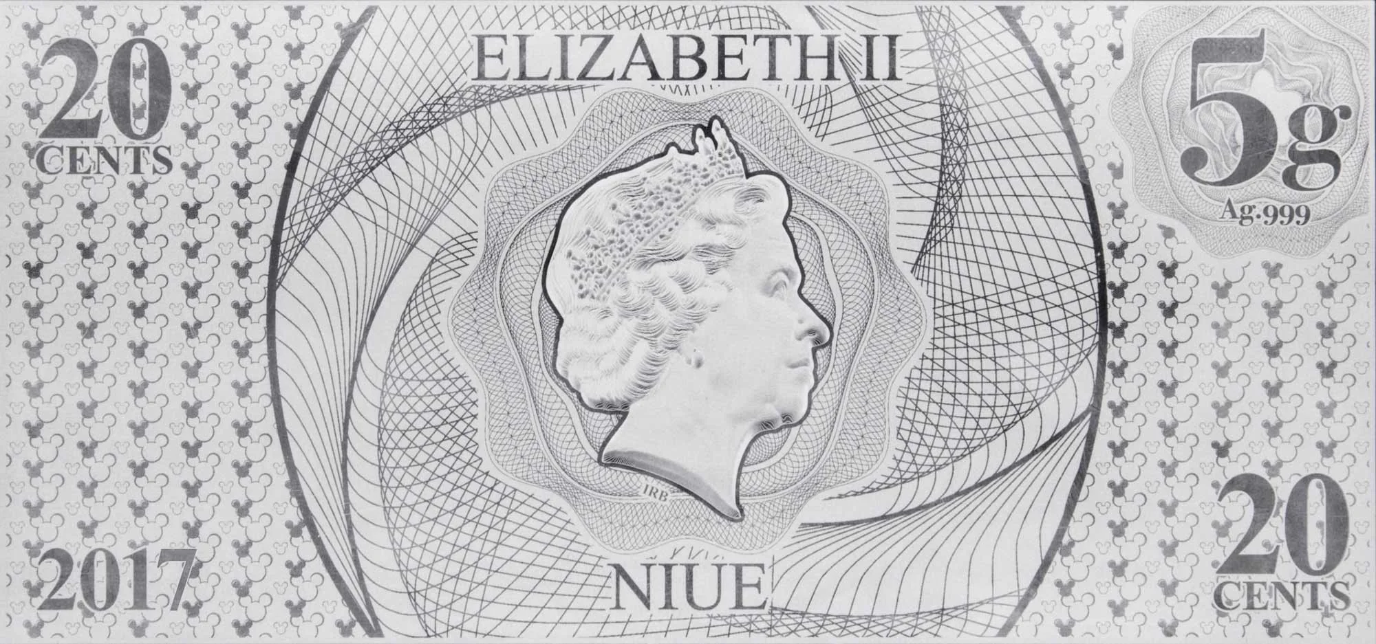 Mickey Mouse and friends appear in full color over an engraved countryside. Each note's unique mintage number is also printed.