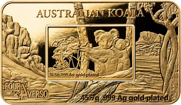 Australian scene centered on koalas, with Queen Elizabeth II's effigy at bottom left.
