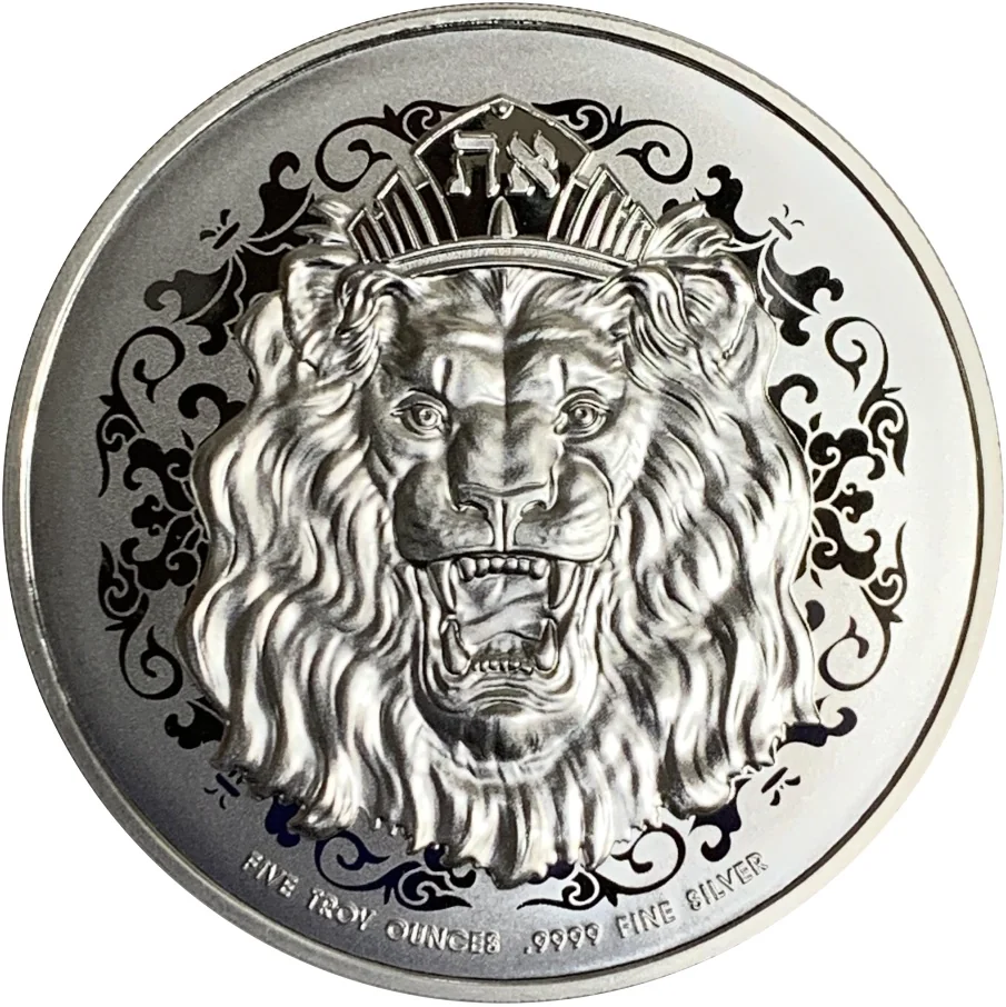 Description: A detailed lion's head wearing a crown, identifiable as the Lion of Judah by the Aleph Tav symbol (תא) upon it. A reflective, regal floral pattern appears behind it.