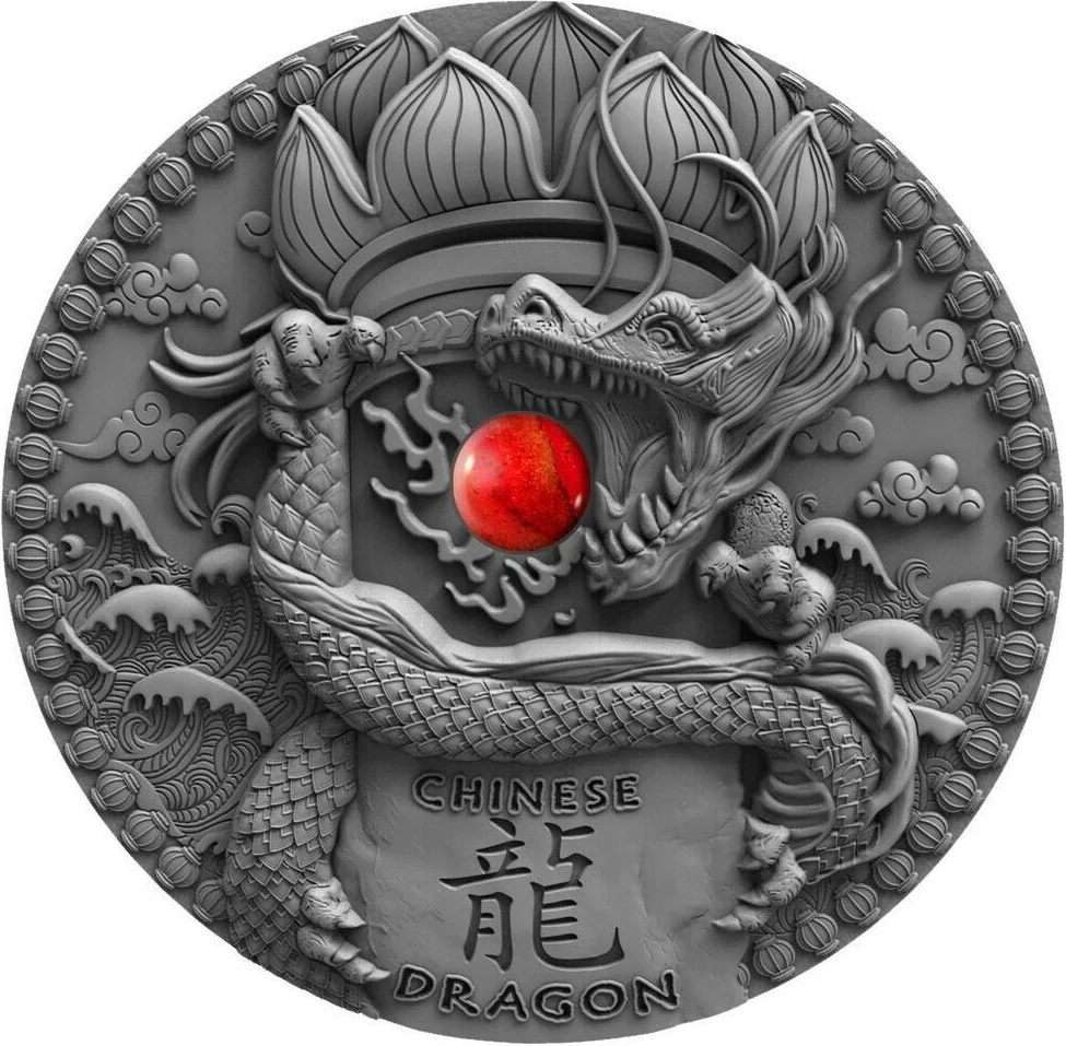 Chinese Dragon encircled by iconic national symbols, with a central coral heart.