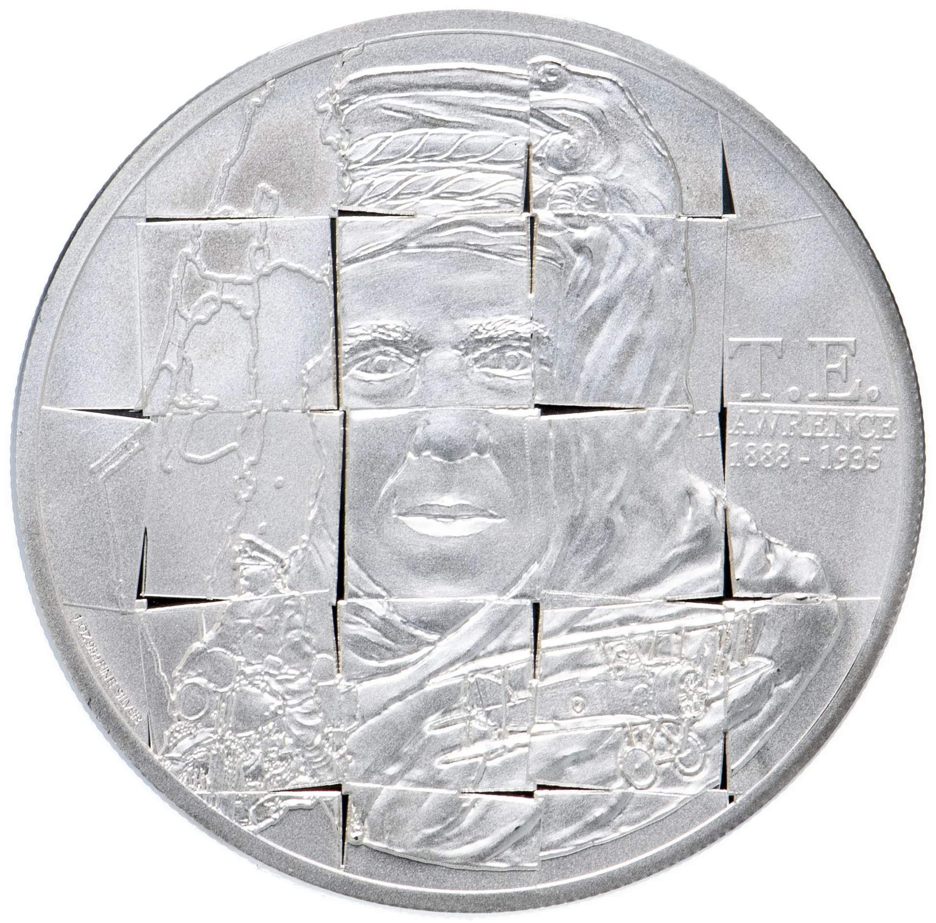 Description: Lawrence's headdress maps the Middle East on one side, while the other's folds evoke the desert dunes he called home. A Sopwith Camel biplane against this backdrop symbolizes his love of flight and RAF service. The fragmented grid represents the complex, secretive layers of his life.
