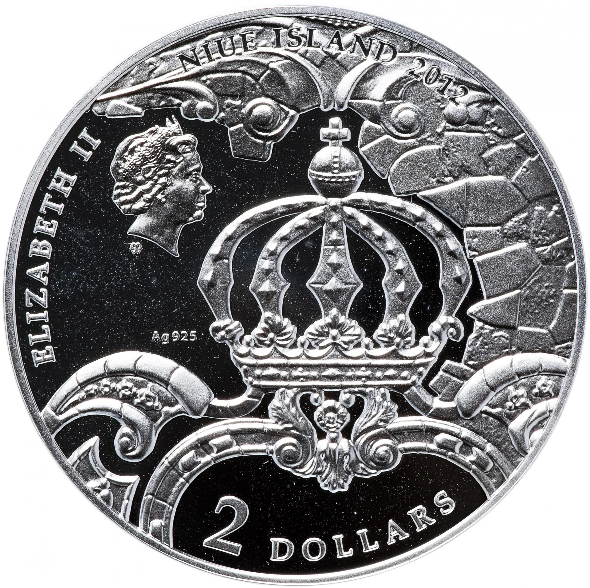 Crown and architecture with Queen Elizabeth II facing right, encircled by legend.