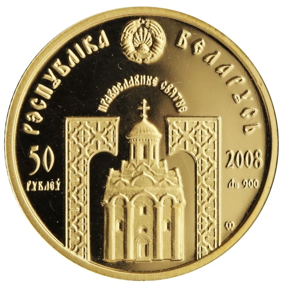 Description: Obverse: Relief image of the State Coat of Arms with the inscription "РЭСПУБЛIКА БЕЛАРУСЬ". Central inscription: "ПРАВОСЛАВНЫЕ СВЯТЫЕ". Main image: The restored Saviour’s Transfiguration church in Polotsk against an ornamental background. Left: Denomination "50 РУБЛЁЎ". Right: Year of issue, alloy standard, and Mint of Poland trademark.