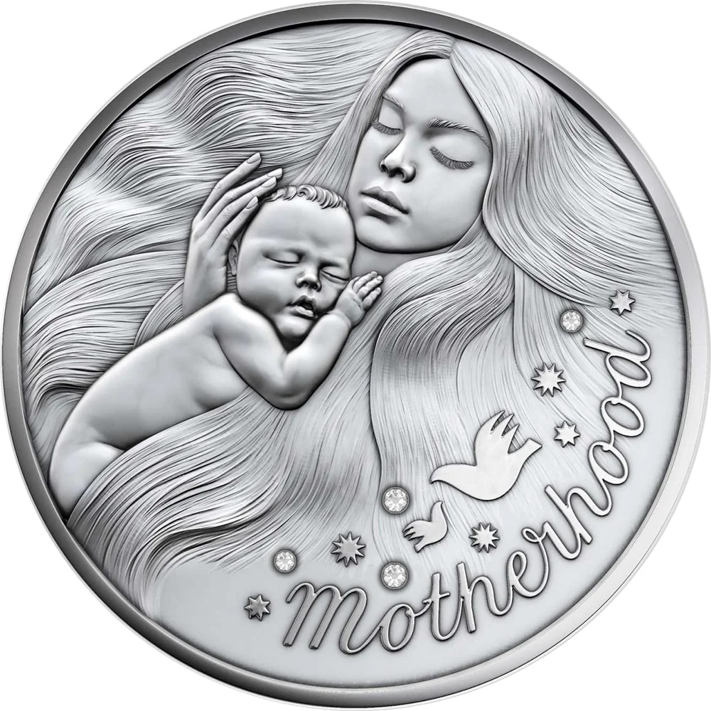 A mother cradles her baby, adorned with crystals and birds.