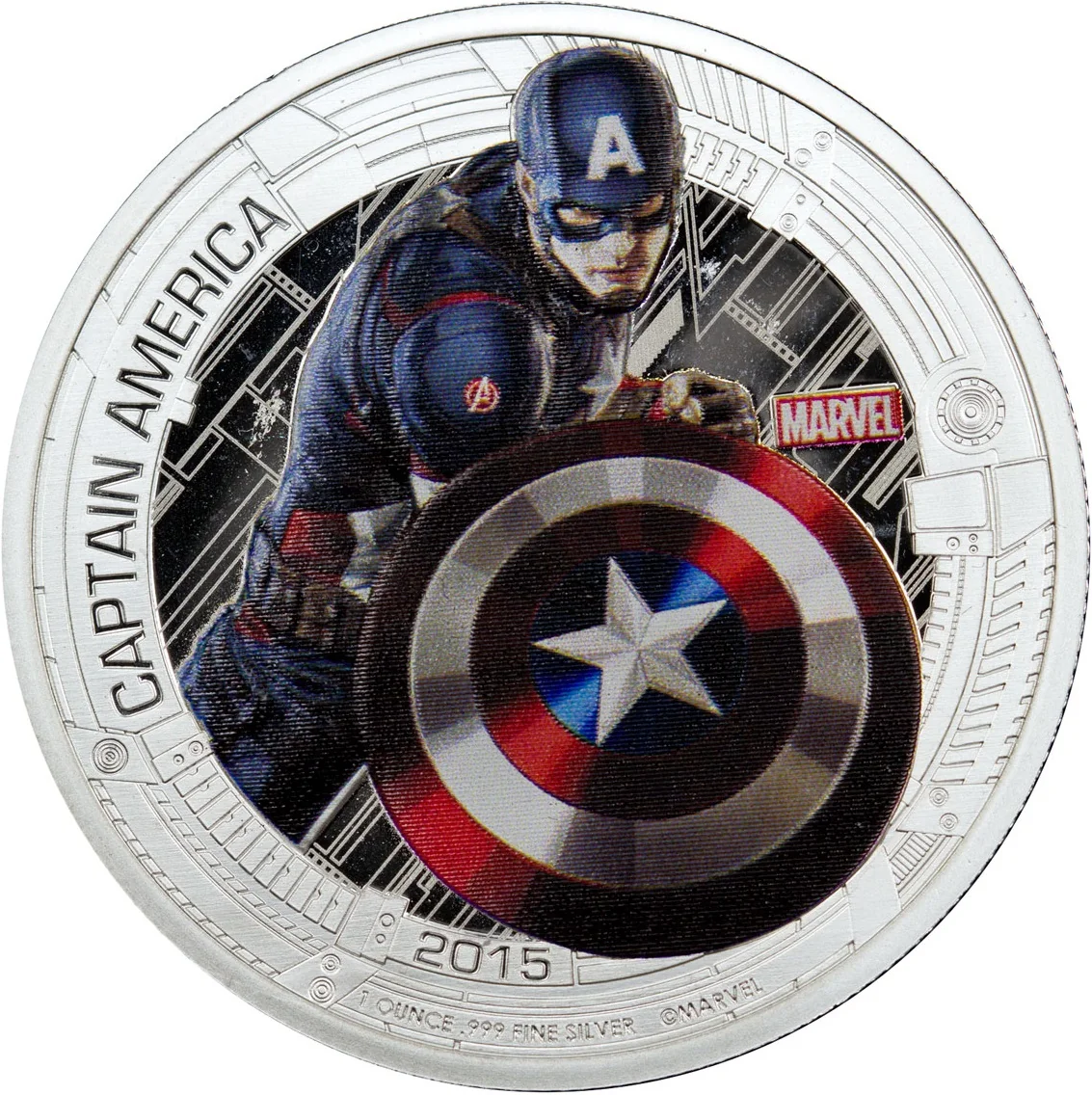 Captain America, in red, white, and blue, holds his star-and-stripes shield.